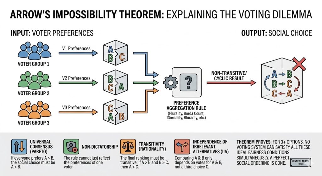 Arrow’s Impossibility Theorem দেখায় যে নিখুঁত গণতন্ত্র গাণিতিকভাবে সম্ভব নয়।