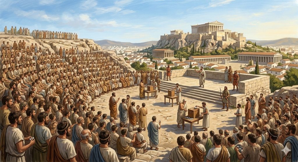 এথেন্সের “গণতন্ত্র” আসলে ছিল শুধুমাত্র প্রাপ্তবয়স্ক পুরুষ নাগরিকদের জন্য। মহিলারা, দাসরা, বিদেশি বাসিন্দারা — কেউই ভোট দিতে পারত না। মোট জনসংখ্যার মাত্র ৩০% ছিল ভোটার।